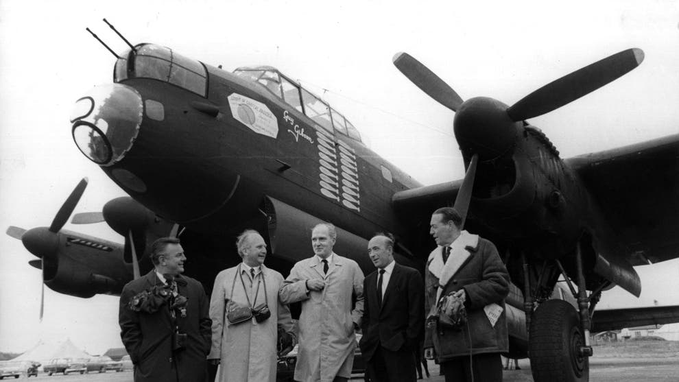 19 May 1967: Members of the original Dambusters crew in front of a WWII Lancaster bomber